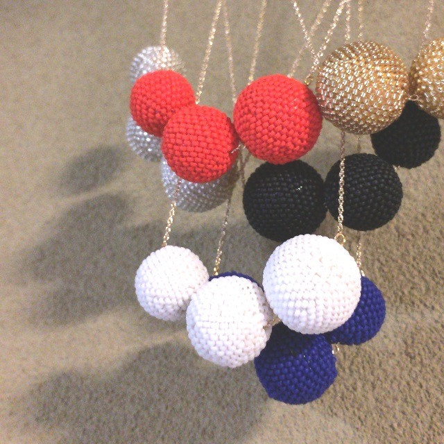 サイズの異なるビーズボール3つを連ねた、シンプルですが印象的なネックレスです。