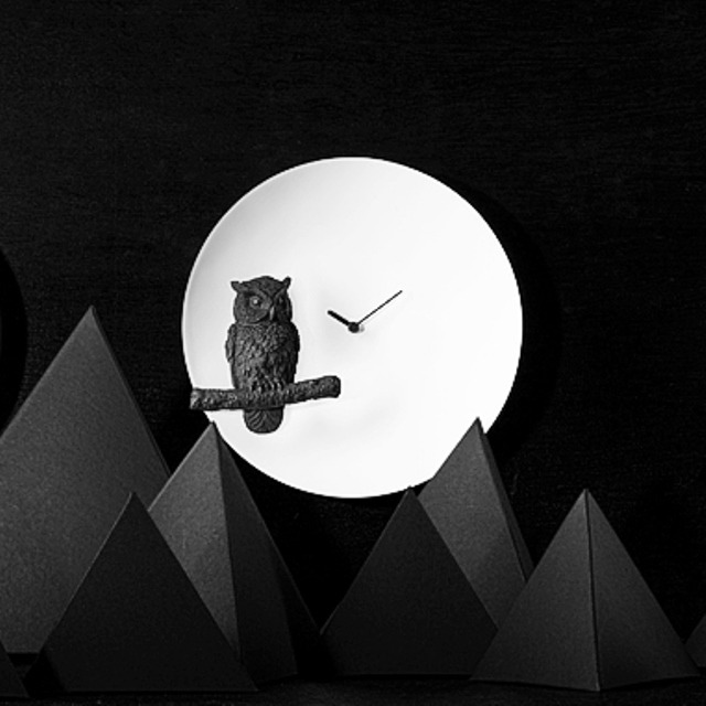 月を表した白い文字盤に、影のように黒いミミズクが印象的な掛時計です。