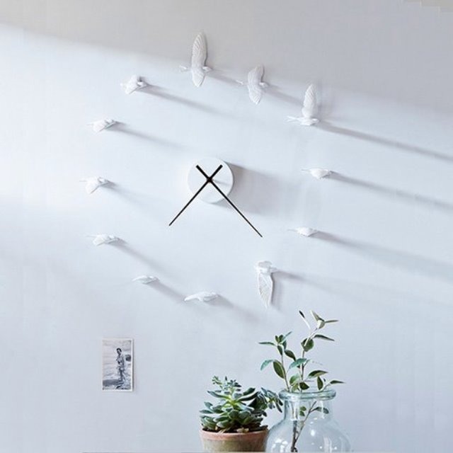 壁に直接ツバメのインデックス(時間を示す目盛り)と長針短針を取り付け、壁を大きな時計にします。